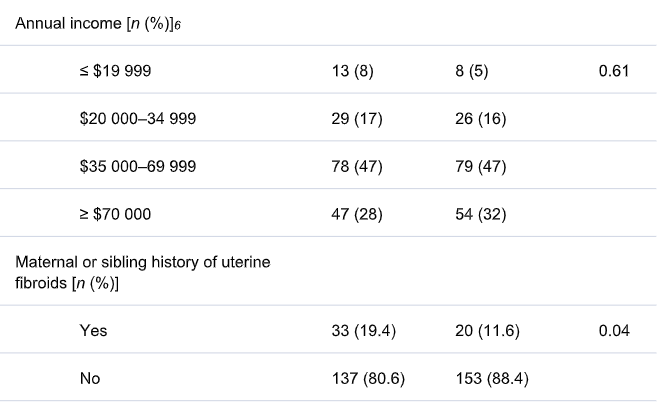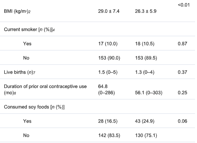 Các trường hợp hơi lớn tuổi, có nhiều khả năng là người châu Phi, Mỹ và có tiền sử gia đình bị u xơ tử cung, có chỉ số BMI cao hơn và ít có khả năng tiêu thụ thực phẩm đậu nành hơn là các mẫu bệnh chứng (Bảng 1). Bệnh và chứng không có khác biệt đáng kể bởi tình trạng người hút thuốc hiện tại, mức độ giáo dục và thu nhập, số lần sinh sống và sử dụng thuốc tránh thai trước đó.