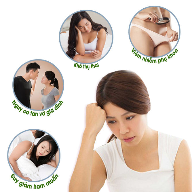 - Âm đạo khô rát, giảm tiết dịch nhờn, giảm ham muốn trong quan hệ vợ chồng.